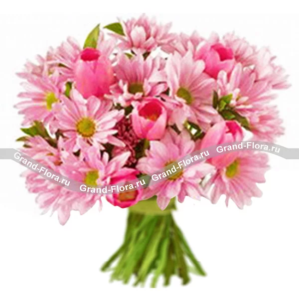 Романтичная и нежная композиция из розовых тюльпанов и хризантем – что может быть лучше для юной прелестницы? Букет из хризантем «Дыхание весны» - это маленькое чудо, которое вы можете подарить своей дочурке или любимой девушке, сестре или подруге, как в праздничный, так и в будний день. Ведь, как приятно получить прекрасный букетик хризантем в подарок от близкого человека «просто так», «без всякого повода».