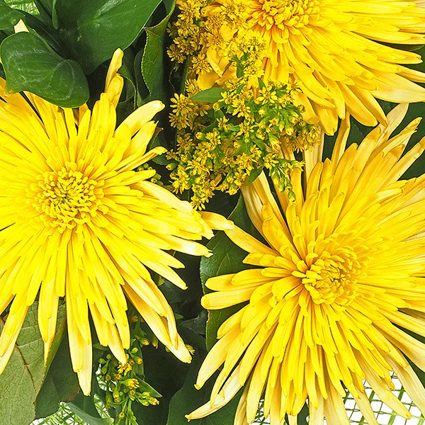 Желтые одноголовые хризантемы составляют центр жизнерадостного букета. Выразительности цветам придают солидаго, салал или рускус. Упакованная в зеленую сетку композиция наверняка порадует получателя в день его рождения. Будьте убеждены, что любой член семьи не устроит перед роскошью букета, будь то Ваши родители или любимые бабушка с дедушкой. Коллега по работе также оценит Ваш безупречный вкус и будет радоваться получению столь шикарного букета. Композиция выразит глубокие чувства благодарности и уважения за Вас.