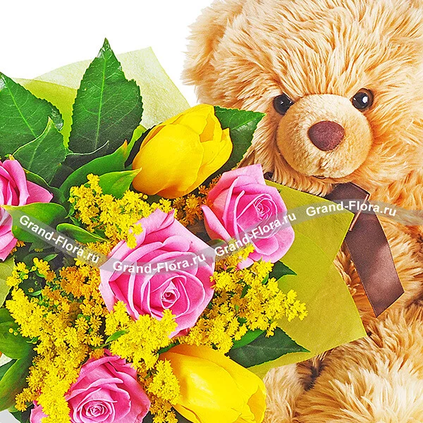 Уменьшенный: роза розовая - 4 шт., тюлпаны желтые - 3 шт., солидаго - 3 шт., декоративная зелень, фетр желтый + мягкая игрушка "Медведь" - 15-20 см.