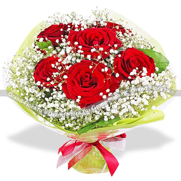 Уменьшенный: роза красная - 5 шт., гипсофила - 3 шт., рускус - 2 шт., фетр зеленый, бант красный.