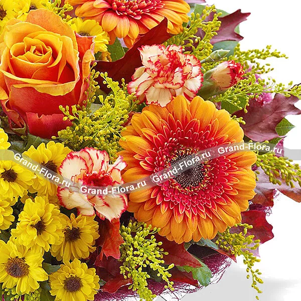 Стандартный (на фото): роза оранжевая - 1 шт., гербера оранжевая - 3 шт., хризантема желтая кустовая (мелкоцветная) - 2 шт., гвоздика кустовая оранжевая - 2 шт., солидаго - 3 шт., сетка бордовая.