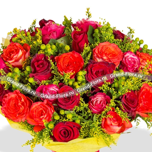 21 роза: роза красная - 8 шт., роза оранжевая - 7 шт., роза розовая - 6 шт., солидаго, гиперикум, фетр желтый, бант красный.