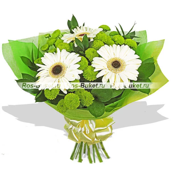 ЛЮКС:  гербера белая - 5 шт, хризантема кустовая зеленая - 5 шт, рускус, фетр зеленый.