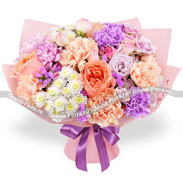 Уменьшенный: роза персиковая - 1 шт.,гвоздика персиковая - 3 шт., гвоздика фиолетовая - 1 шт., роза кустовая розовая - 1 шт., роза кустовая фиолетовая - 1 шт., хризантема кустовая ромашковая фиолетовая - 1 шт., хризантема сантини - 1 шт., статица, упаковка, лента. Примерный размер: 25Х25 см.