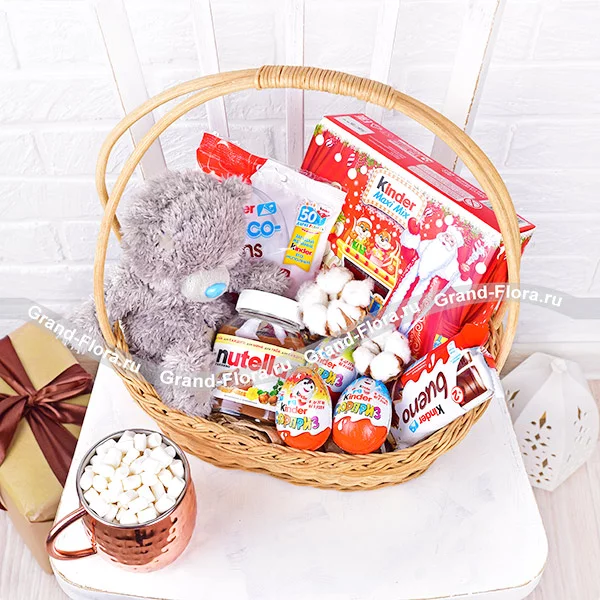 Стандартный: набор "Kinder Maxi Mix" - 223 г., киндер "Choco bons" - 125г., киндер "Сюрприз" - 3 шт., киндер "Bueno" - 1 шт., мишка серый до 30 см., шоколадная паста "Nutella" - 180 г., хлопок - 2 шт., корзина.