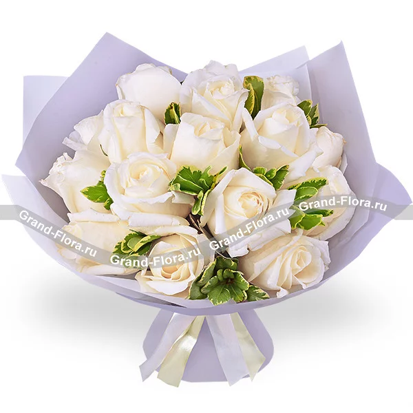 Букет выполнен из белых роз сорта Ломоносов, с точечными акцентами фисташки в оформлении из фетра светлого оттенка и ленты в тон букету. Диаметр букета зависит от выбранного Вами количества роз. Обращаем Ваше внимание, что состав и оформление букета могут отличаться.