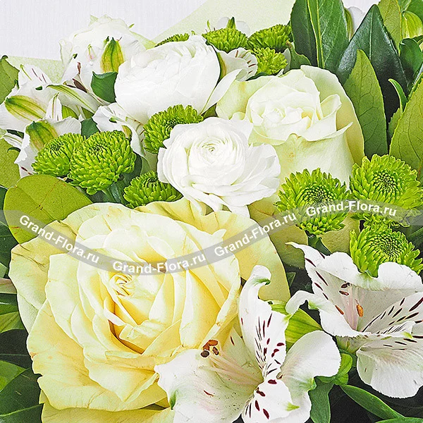 ЛЮКС: роза белая - 9 шт., эустома белая - 5 шт., альстромерия белая - 9 шт., хризантема кустовая зеленая - 7 шт., фетр зеленый.
