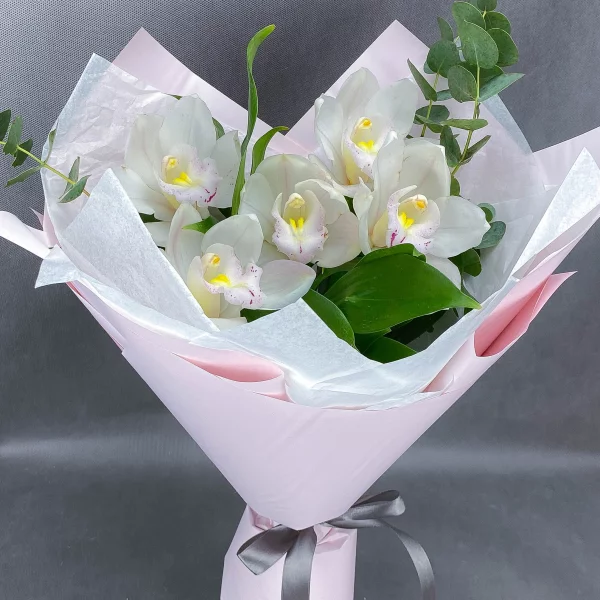 Элегантный, необычайно притягательный и изысканный букет из орхидей с декоративной зеленью - идеальный подарок! который приятно получать, но не меннее приятно преподносить. Дарите радость и приятные моменты близким и любимым как по случаю торжества, так и без особого повода! Будьте уверены - такой цветочный сюрприз не оставит получателя равнодушным.