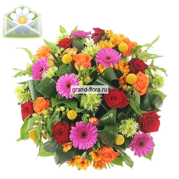 Такой яркий, солнечный букет роз, гербер и хризантем подойдет к любому случаю. Хотите пожелать процветания и оказать знак уважения? Подарить ощущения праздника? Тогда закажите букет и роз и хризантем с доставкой в нашей службе доставки цветов.